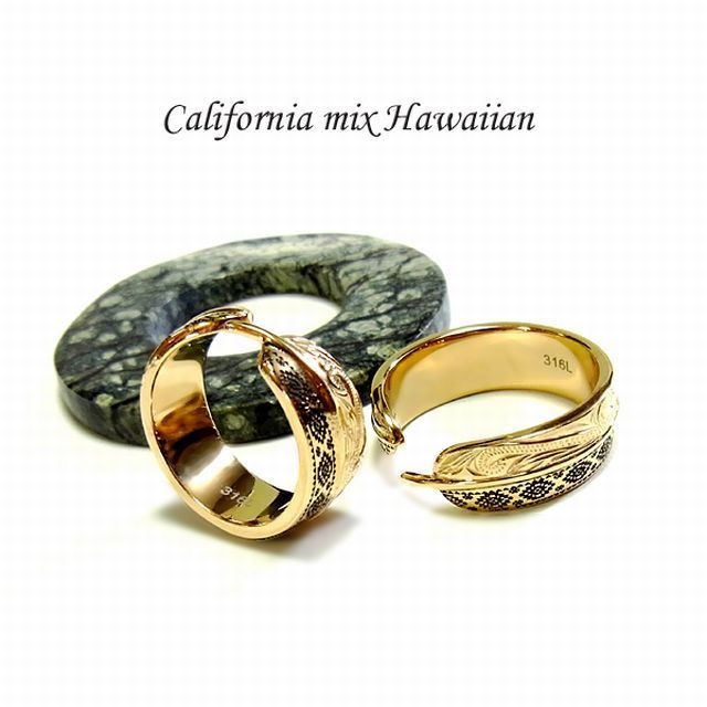 【送料無料!!】ハワイアンジュエリー リング フェザー オルテガ柄 K14イエローゴールドコーティング