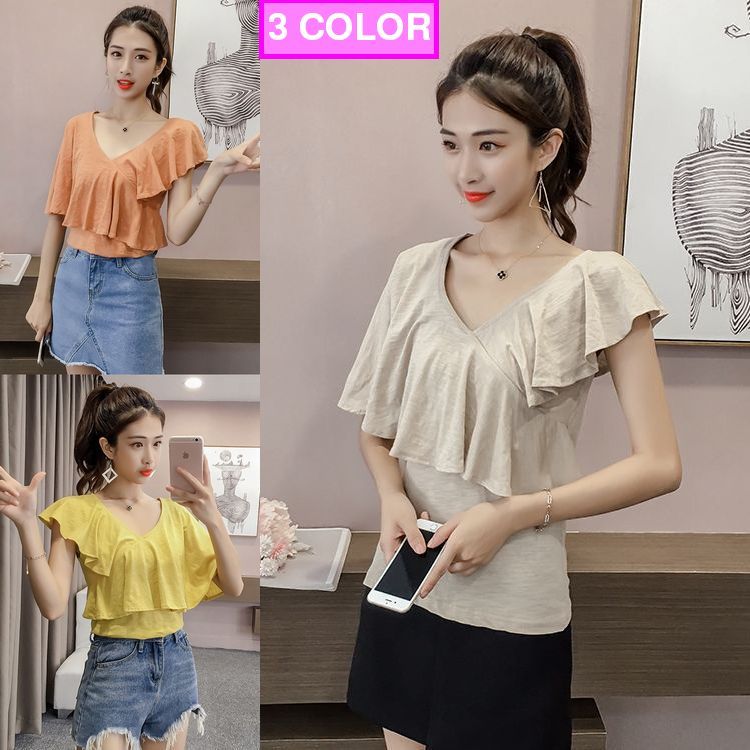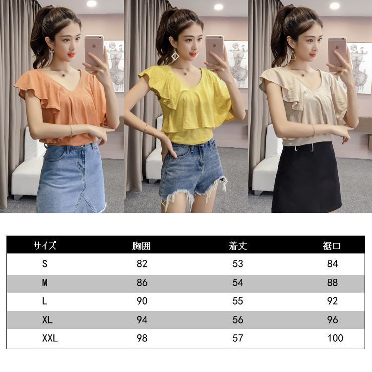 襟ぐりを詰めたカジュアルなVネックが大人っぽさを演出し、今っぽいムードに。